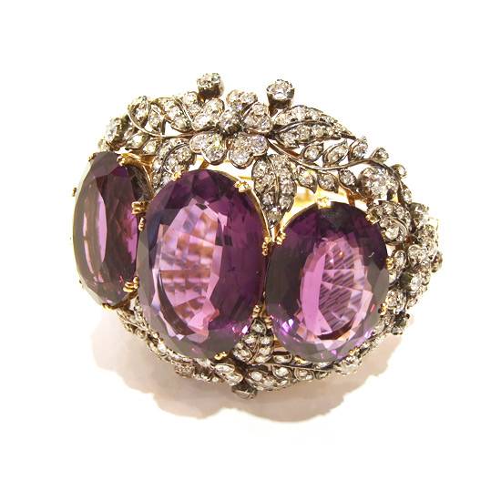 This is an amethyst and diamond bangle set in 925 silver and 18k gold. It features three giant oval amethysts. Multiple white diamonds are set in the shape of flowers and leaves.