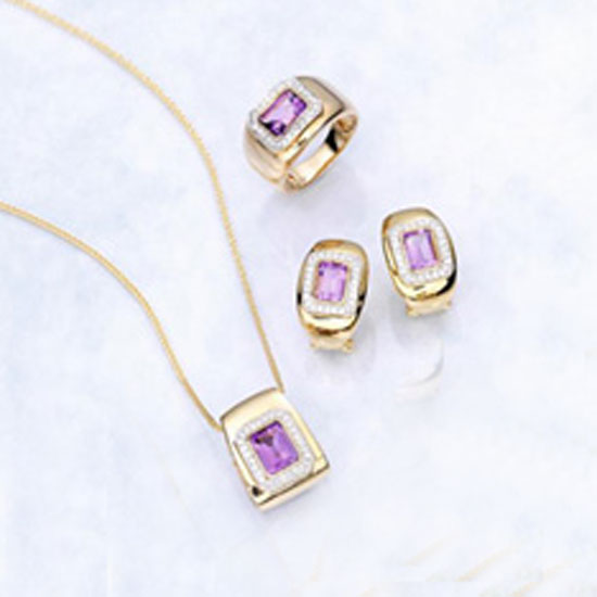 Shown here is a collection of jewelry set made with purple amethyst and diamond. The rectangular amethyst presents fascinating shine and charm. The golden band and sparkling diamonds lends extra glamour to this set.