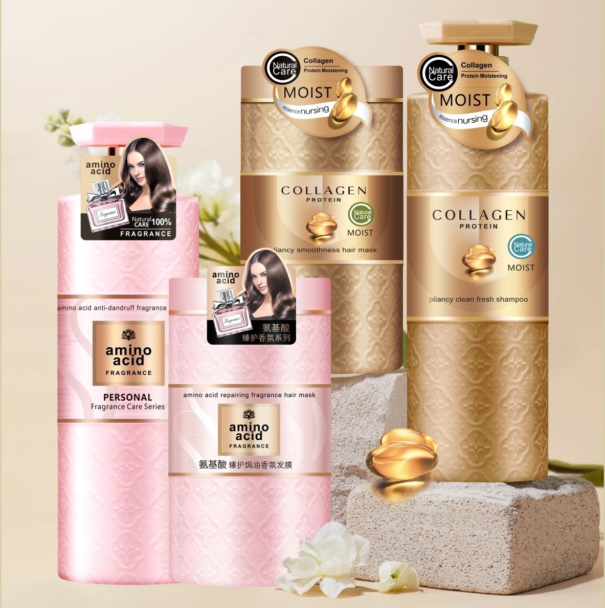 Amino Acid series gently cleanses, reducing dandruff while caring for sensitive scalps, while the hair mask deeply repairs damaged strands. Collagen series offers oil control with lightweight volume, and the mask smooths frizz for silky shine. Together, these four products meet different hair needs—from cleansing to repair—for healthy, beautiful hair.