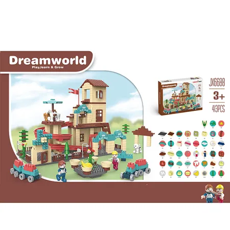 Amusement park building blocks 413PCS large-particle building blocks: comfortable color matching, rich and diverse creative shapes, parent-child interaction, imagination, hand-eye coordination, observation and exploration, role-playing. Meet the children's building block building needs, let creativity not be limited to imagination, and record the children's unconstrained nature. Rounded large-particle building blocks, rounded corner design, smooth and burr-free, smooth surface cares for the baby's immature hands. Abundant simulation accessories to make food and complete transactions. Comfortable color matching, the beauty is cultivated since childhood, ABS environmental protection material, safe, tasteless and burr-free, enlarged particle building blocks, compact and non-shedding.