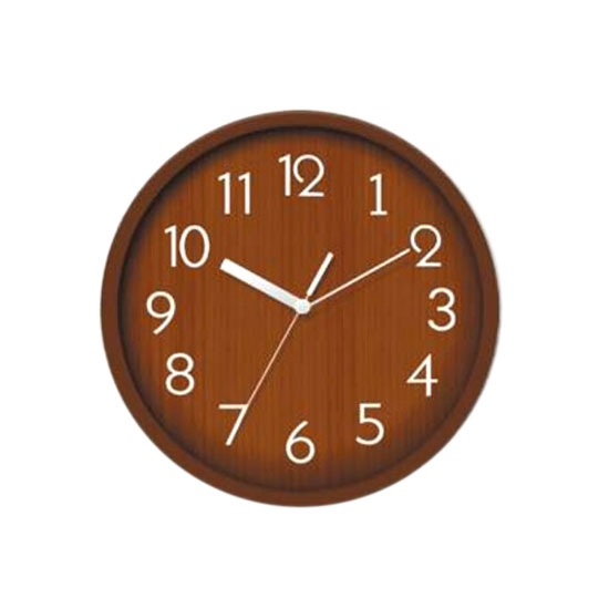 This is an analog clock with a neat appearance. It features a round casing and a round dial with wood textures. The clock is completed with white Arabic numbers and 3 white hands.