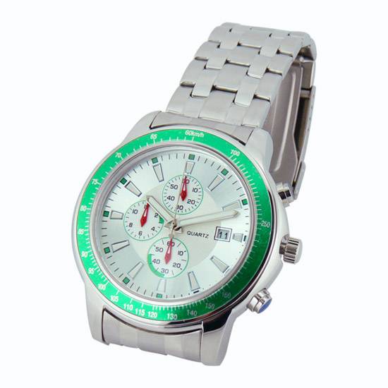 This three-hand analog watch features a circular dial with three sub-dials. The bezel is plated in sharp green to make the watch more eye catching. It also comes with a stainless steel case and three crowns. The metal strap is perfect for showcasing a masculine detail. It is an ideal piece for energetic men.
