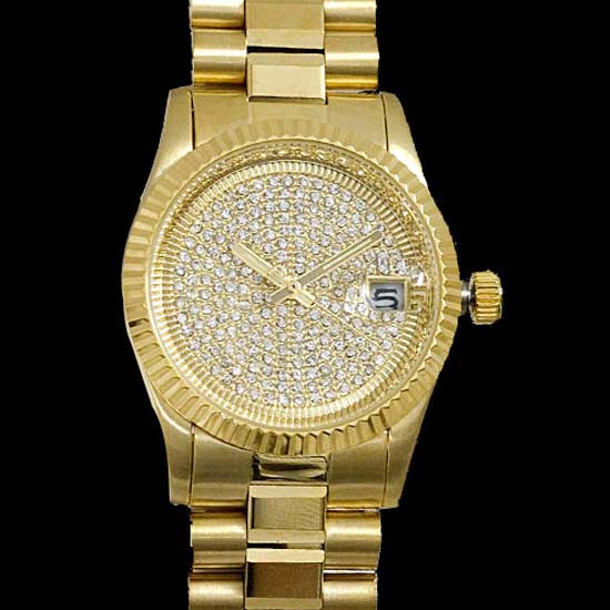 Showcased here is an analog watch with an elegant design. The circular bezel is carved with unique patterns for added style. The numberless dial is set with dazzling stones. This exquisite watch simply raises the glamor of the wearer.