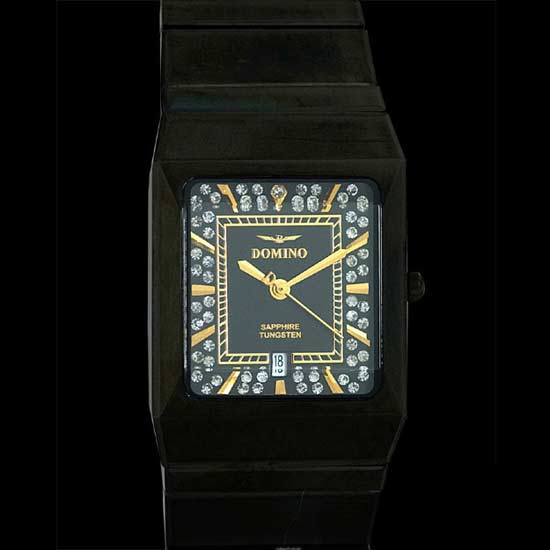 This analog watch in black exhibits a mysterious look. The rectangular dial features a numberless design. The golden hands express a luxurious touch. This watch radiates the charm of the wearer.