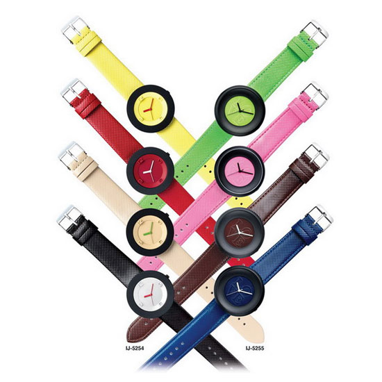 The trendy watches come in two different designs. The ladies' watch features letters of "L-O-V-E" on the dial, presenting young and modish appeal. The analog watch with a raised index dial creates a stylish fashion statement. Completed with a black alloy case and grosgrain looking straps, the colorful watch simply lightens up your daily look.