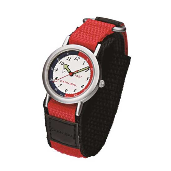 This analog watch is an ideal choice for children’s time tutoring. It comes with a round dial with red & blue half-rings, words of “to” and “past” and three hands. This chic wristwatch is finished with a sturdy red and black strap.