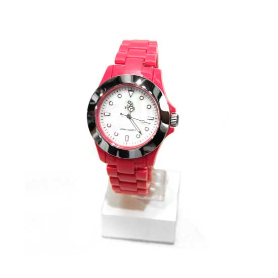 This plastic analog watch comes with a pink band and a round white dial for a chic touch. It is highlighted with a silvery-hued bezel with a glossy finish. This adorable analog watch is a great addition to your wrist.