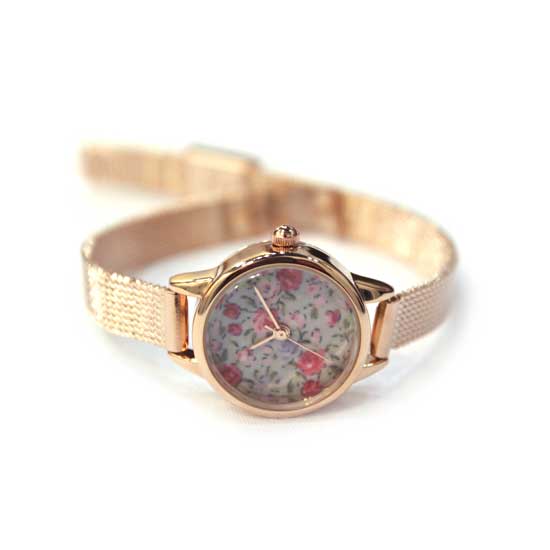 Displayed is a women's analog watch that comes in a charming rose gold color. The dial, decorated with a floral background, is rimmed with a smooth and shiny bezel. The strap is made of alloy and is designed in a thin manner so that it fits the wrist very well.