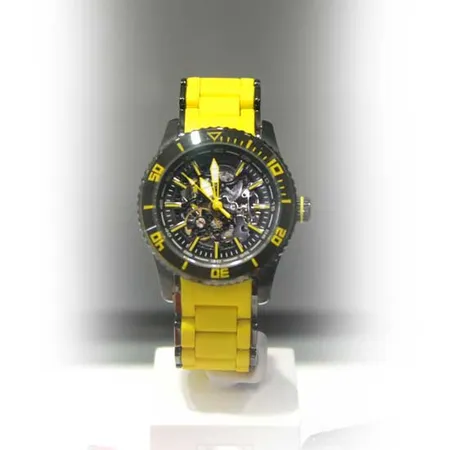 Displayed is an analog watch that comes in a sharp yellow color for a cool effect. Featuring a skeleton design, this wrist watch allows you to see its automatic movement behind the dial. The case is made of stainless steel for durability while the strap is made of silicone for a comfort wearing experience.