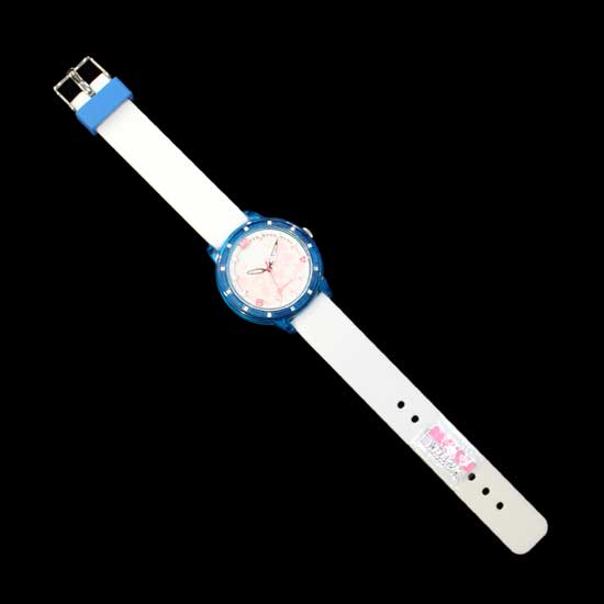 Displayed is a women's quartz analog watch that comes with a white strap and a blue bezel. The round white dial is decorated with three pink hour markers for a lovely look. The strap is made of silicone for your comfort.