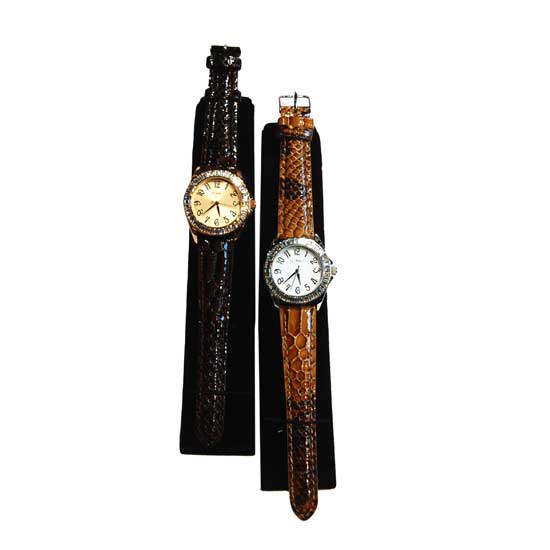 These are two analog watches for men and ladies. These watches come with snake skin leather straps with delicate patterns for a fashionable touch. These watches are crafted with round dials, three watch hands and 12 Arabic numeral hour markers for easy time reading.