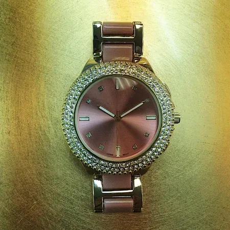 This is an analog watch that is accented with shimmering crystal stones on the bezel. The round dial face has three hands and a date display. The modern and elegant design pairs with your outfit easily.