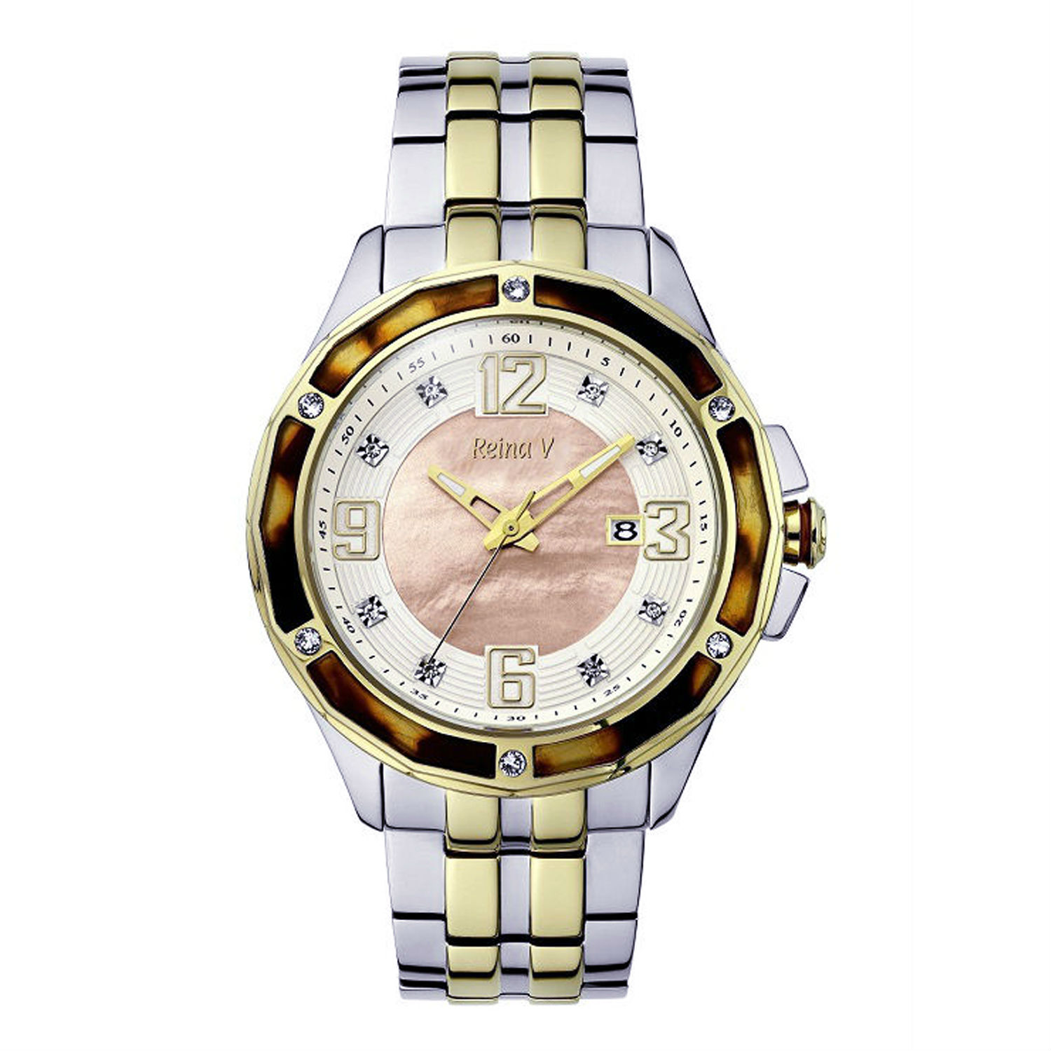 • Patterned dial adorned with CZ stones and pink mother of pearl.