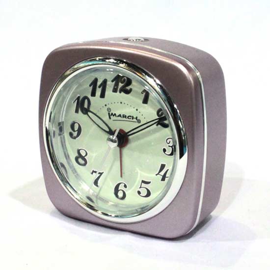 This analogue alarm clock comes in a conventional square shape in a molded plastic case. The light shows the time clearly even in complete darkness. The beep alarm is loud and effective.