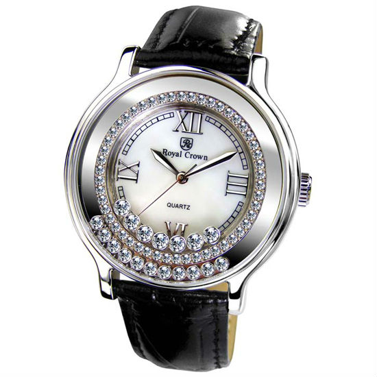 The highlighted analogue wristwatch features a classic design with a round pearlescent dial framed in a silver-tone brass bezel accentuated by sparkling stone embellishments throughout. The contrasting Roman numeral hour markers with matching hands give a clear display of time while the leather-like strap brings a touch of refinement to the watch. Simple yet exquisite, this watch is perfect for work and everyday use.