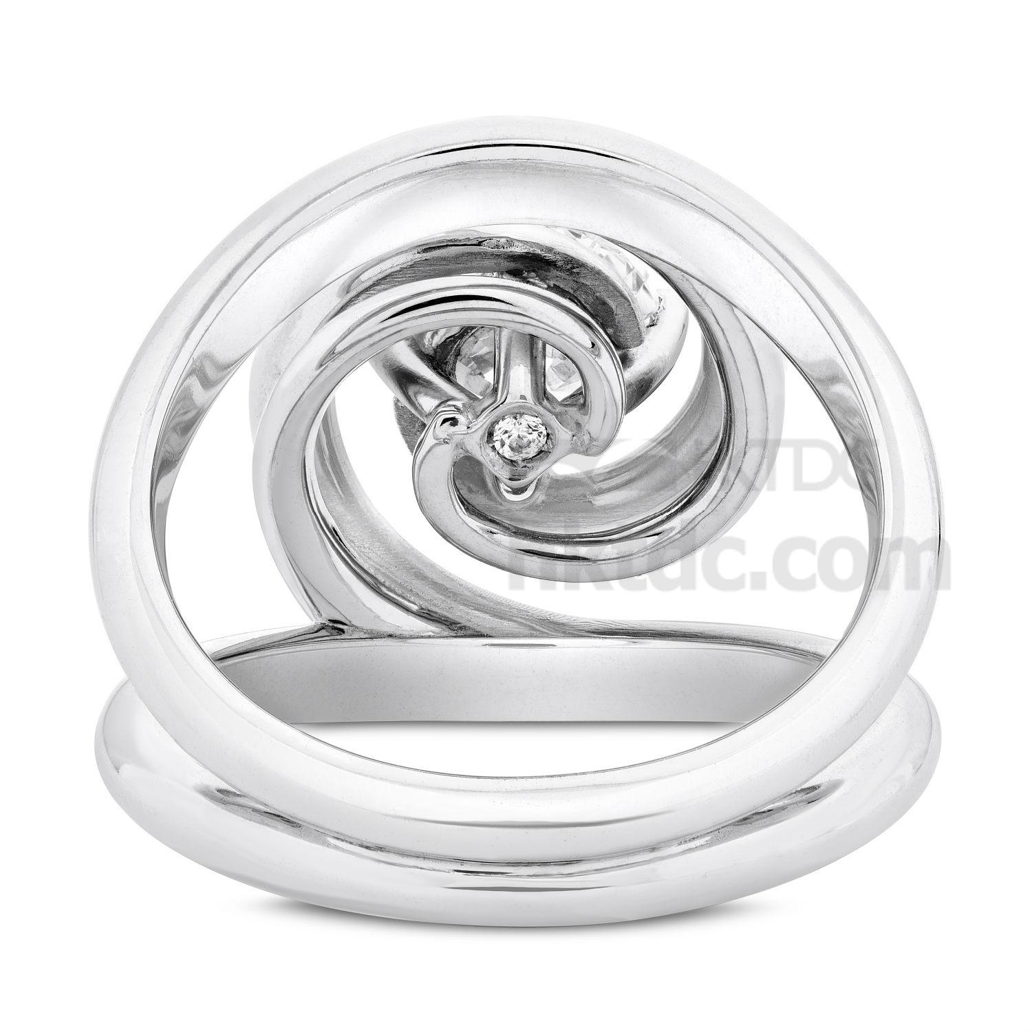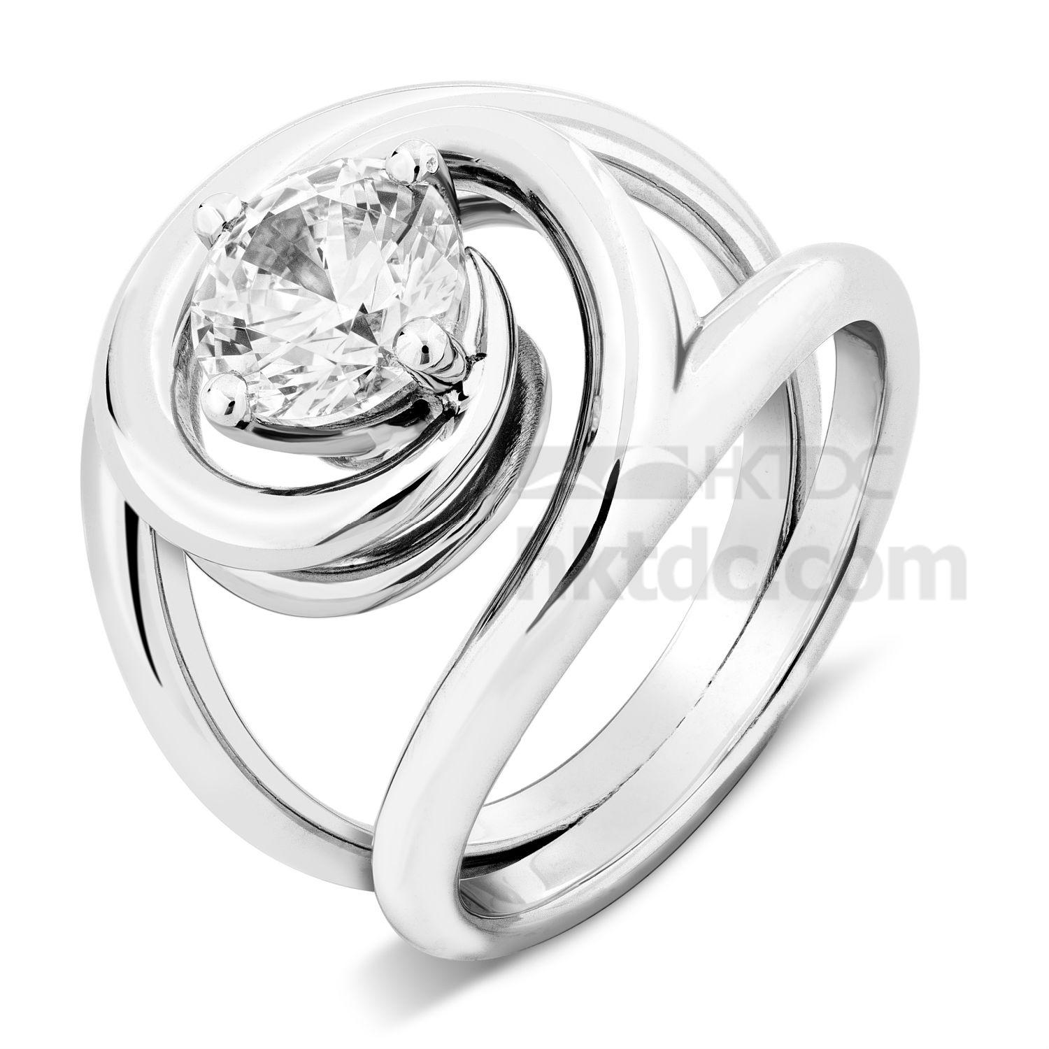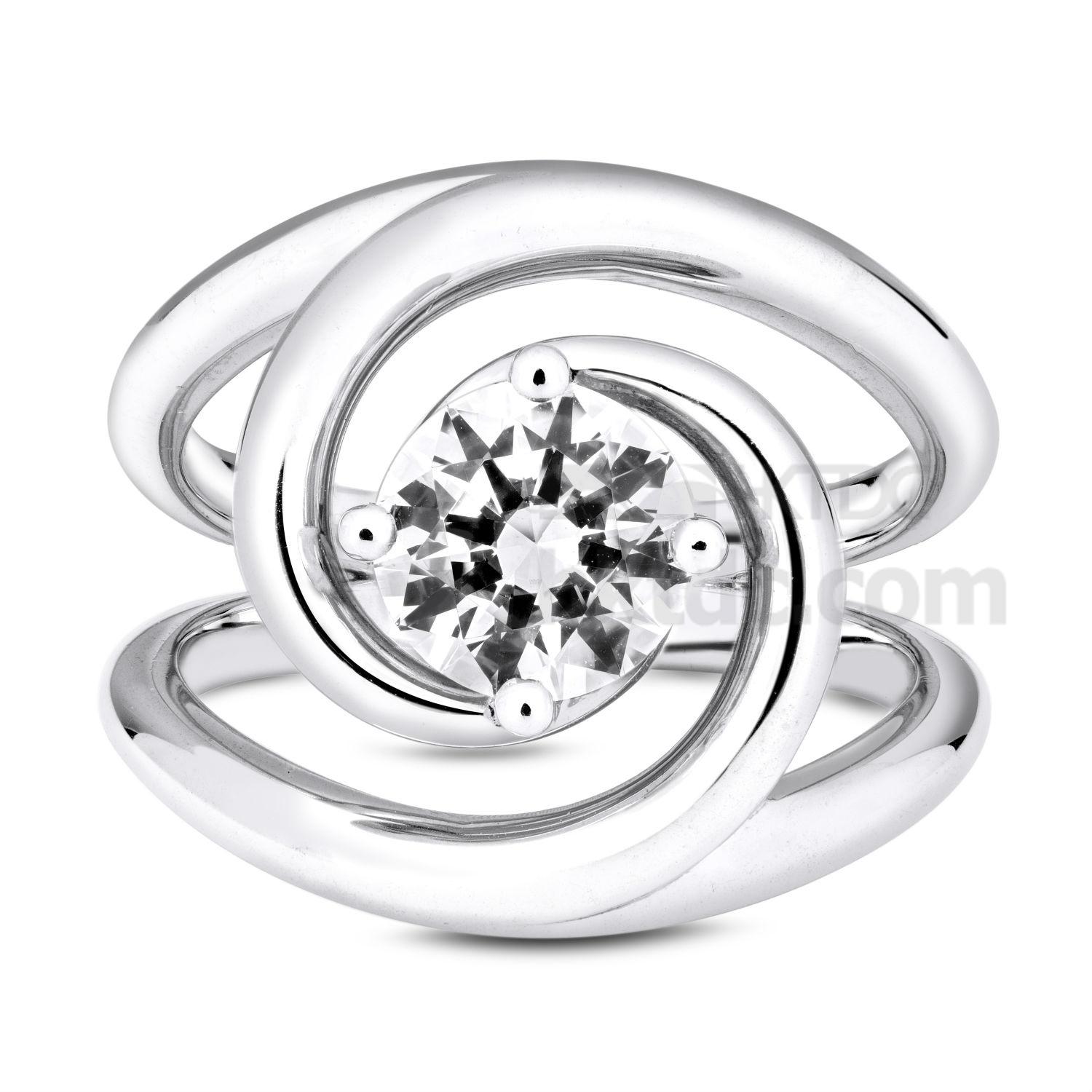 A gleaming double band of 18kt gold wraps around the finger to create a setting for a center diamond. Inside the band, set just under the center stone, a reflection of the diamond’s light streaming inside. Center stone available from 1.50 ct.