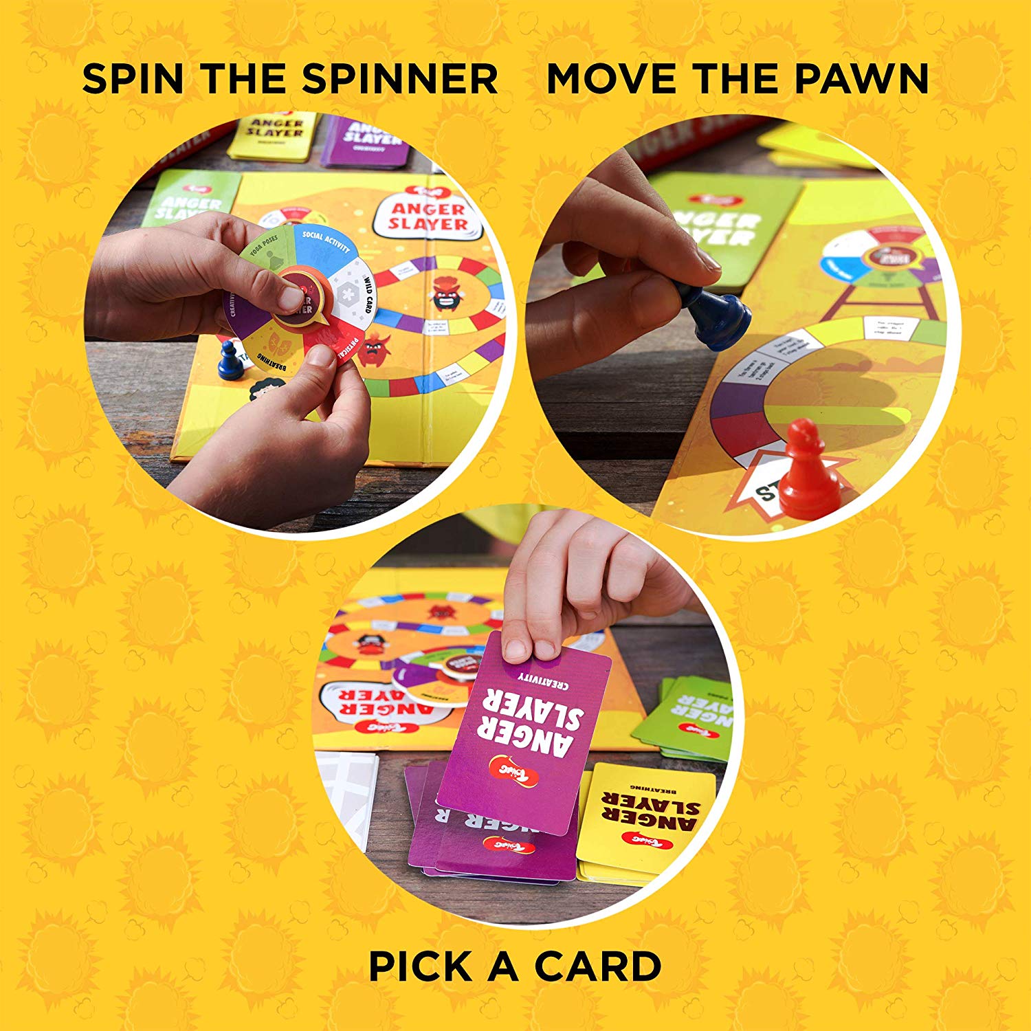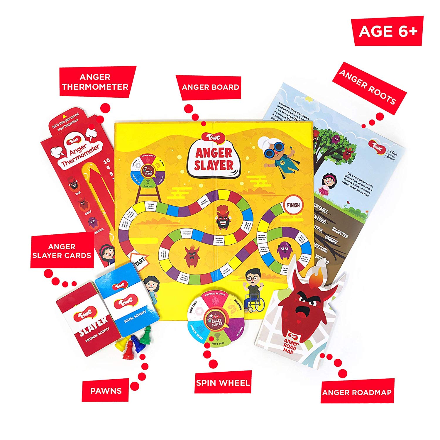 WHAT'S INSIDE: Anger Slayer Board Game with 4 pawns, Anger Slayer Spin Wheel, Anger Slayer Cards, Anger Thermometer, Anger Roots and Anger Roadmap