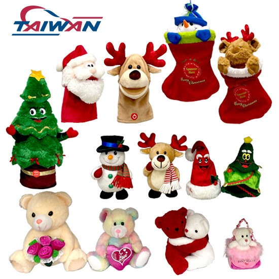Top-left: singing Christmas hand puppets (reindeer & Santa) with changeable voice; Top-right: 12" Peek-a-boo singing Christmas socks (Snowman & Reindeer); Central left: 16" swinging, rotating & singing Christmas tree; Central right: walking whistling snowman & reindeer, vibrate-and-swinging Christmas hat and Christmas tree; Botttom row from left to right: (1) 12" Valentine bear holding light-up fabric roses with voice massage, (2) 9" message-recordable tied-dyed bear with heart pillow; (3) 8" Red and white hugging bear couple; (4) 7" white bear in velour hand bag with feather and crystal beads handle.