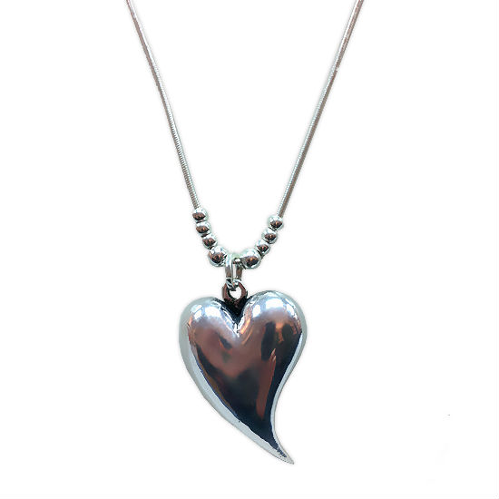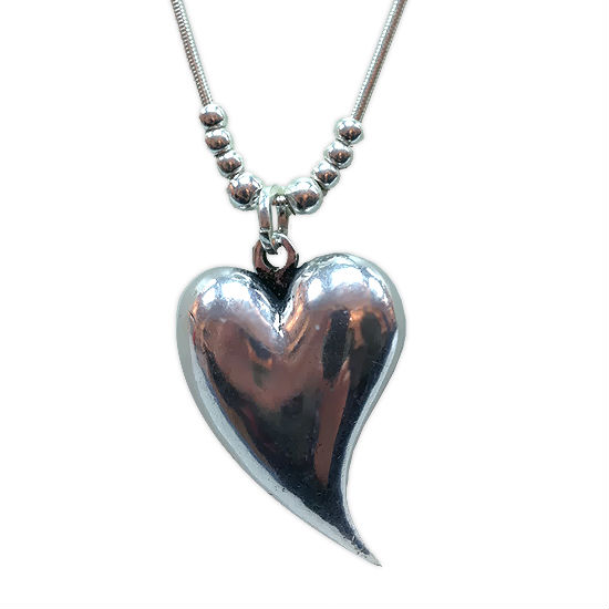 This stylish heart pendant speaks simply of love. A shiny alloy-plated pointed heart dangles from a snake-chain necklace embossed with silver toned beads, adding charms and attractiveness to this jewelry piece.