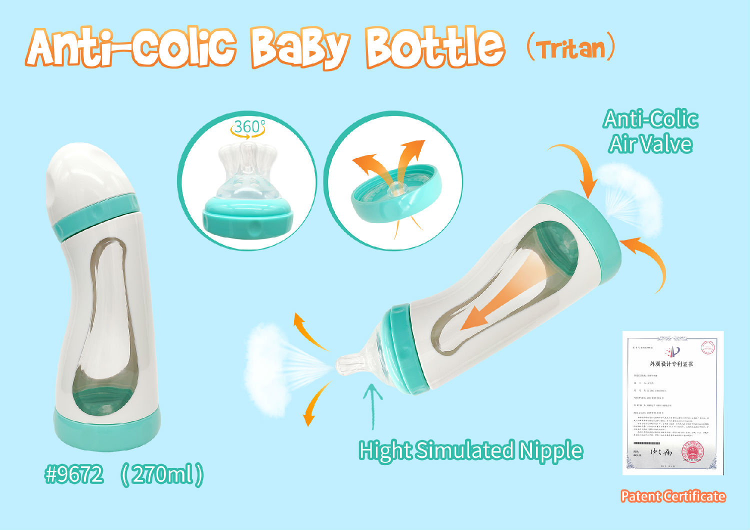 • Anti-colic Baby Bottle(Tritan) designed to vent air away, reduce gas and fussiness.