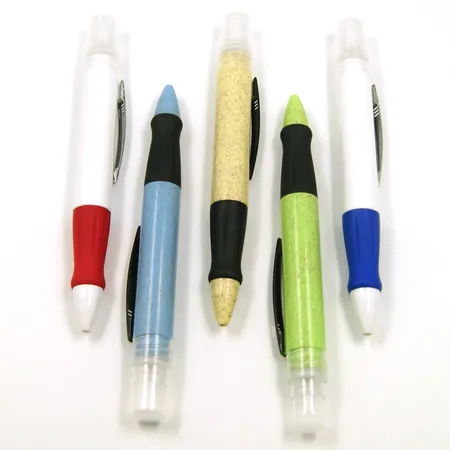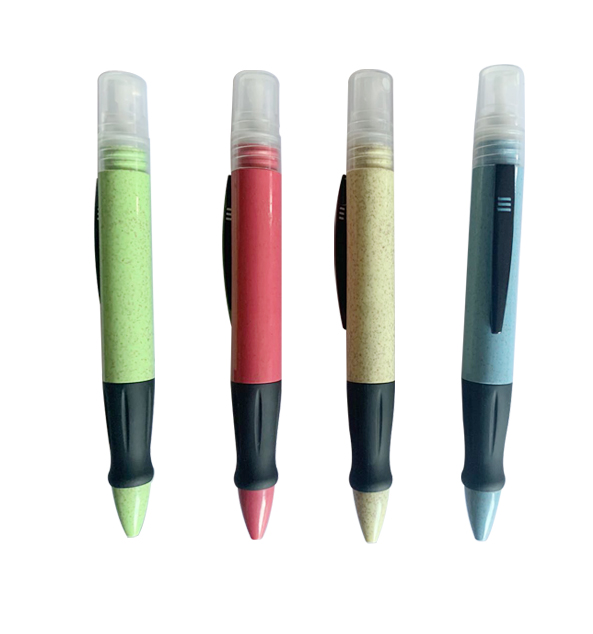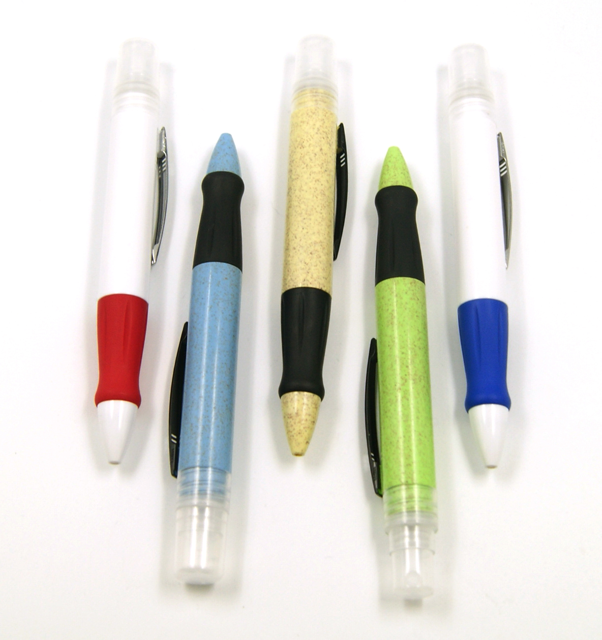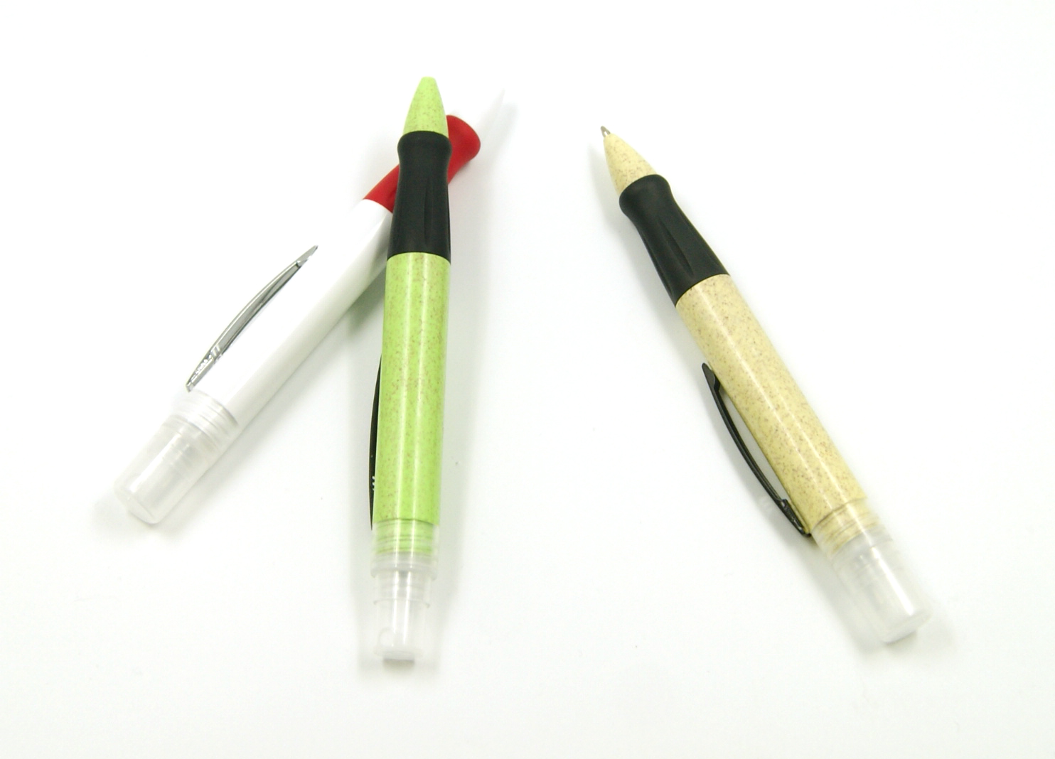 This ballpen's material is antimicrobial additive with plastic together. The item can use for writing, with a spray on top, it also can put in hand sanitizer, alcohol and perfume for personal using.
