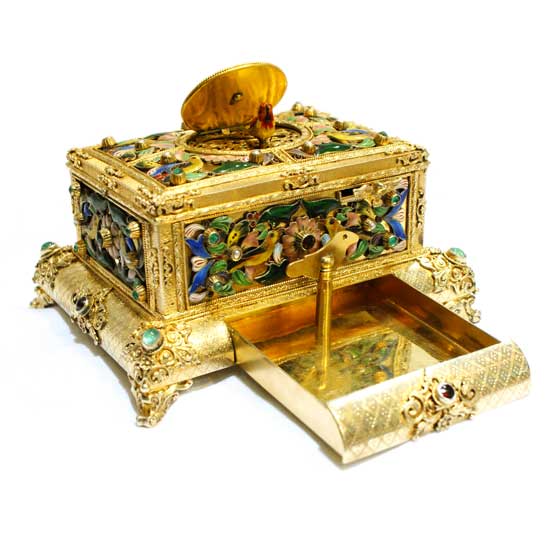 Showcased is an antique royal curio finished with a gold core. The whole piece is luxuriously dressed with elaborate floral, bird and swirled details. This exquisite and brilliant piece makes a perfect ornament for any grand-style decors.