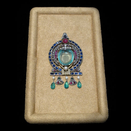 Showcased here is a delicate Egyptian style antique pendant. This unique piece of jewelry is skillfully crafted with assorted natural gemstones such as emeralds, sapphires and rubies. It boasts a strong ethnic touch that sets it apart from others.