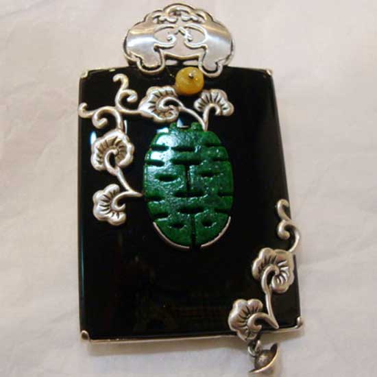 This pendant flaunts a unique oriental style with a green jade carved in the Chinese character of ‘double happiness’. The silver setting is carved with embossed Chinese clouds and leaves by brilliant craftsmanship. A vintage accent is added to the silver to show a classy appearance.