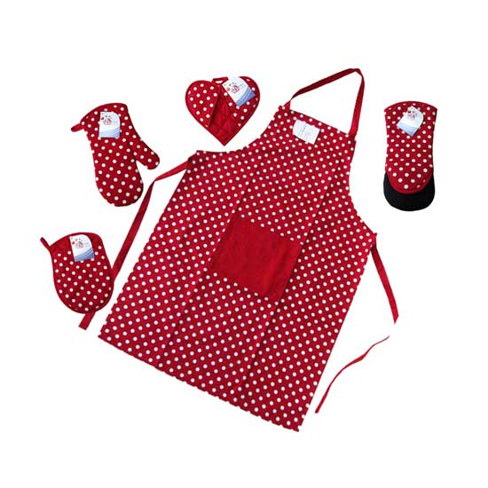 This is a 5-piece kitchen set coming with an apron, oven mittens, a pot grabber and so on. They feature allover white polka dots against the bold red background for cuteness. There are various materials available for your selection.