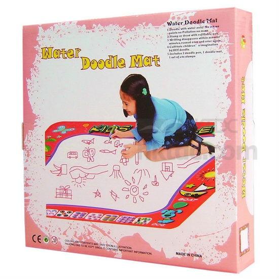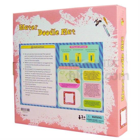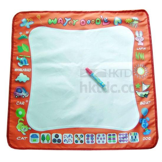 This square-shaped playmat is a fun toy for children to draw on. The included pen can be filled up with water for drawing on the playmat. As the playmat dries, a large blank area is available for drawing again.
