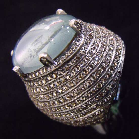 This is a beautiful aquamarine in a nice soft blue color. The gemstone is cut into an oval shape and polished into a shiny surface. The setting is paved all over with sparkling diamonds to showcase the glamor of the aquamarine.