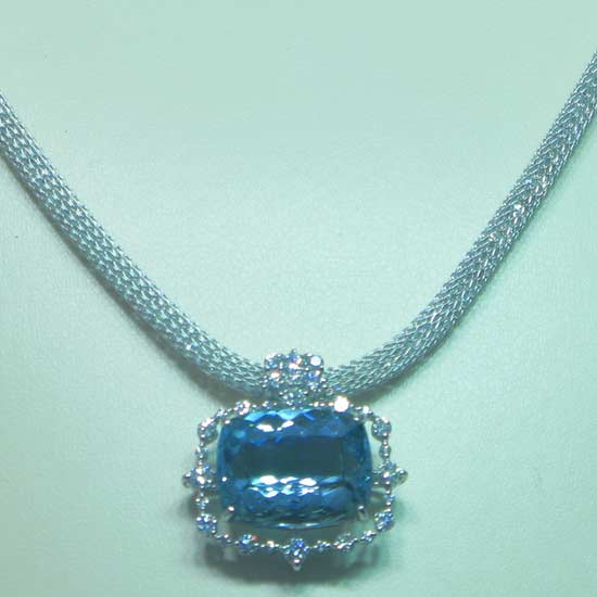 The admirable necklace showcases a simple but elegant design, featuring a fine piece of twinkling aquamarine. The sparkling aquamarine exhibits charming blue shine that you cannot resist. Finely encrusted with shiny platinum, the well-executed necklace is a heart-capturing gift to your special one.