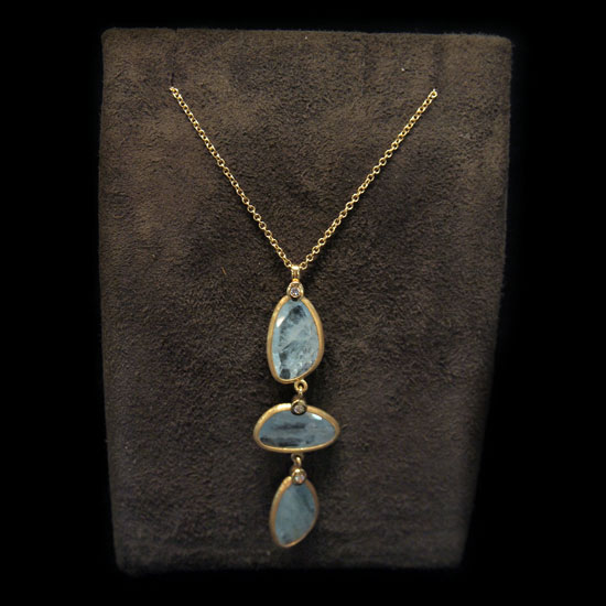 The necklace is hung with a chain of asymmetrical-shaped pendants. The latter are embedded with aquamarine stones which flaunt a pleasing light hue. Combined with 18K yellow gold composition, this jewelry highlights your neckline with easily noticed luxury and elegance.
