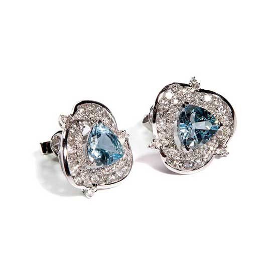 This pair of aquamarine earrings comes with a graceful and stylish appearance. The aquamarine main stones feature a charming light blue color. They are surrounded by finely cut and polished white diamonds.