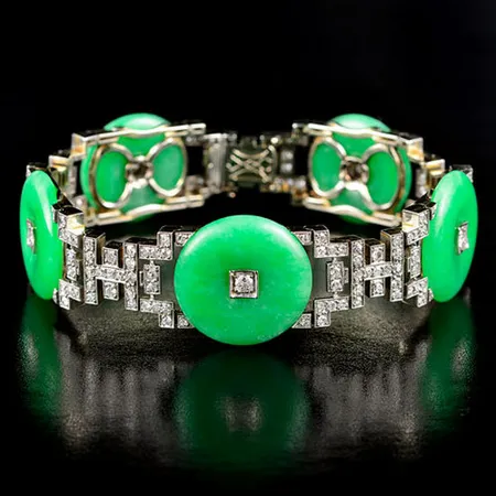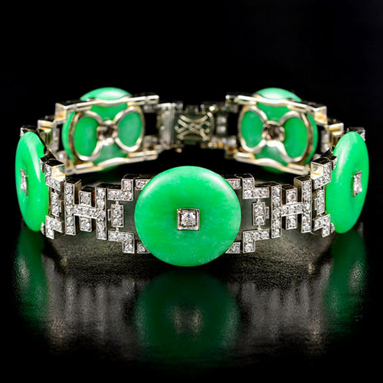 This is a beautiful French-made jade bracelet from the Art Deco period. Carefully crafted with round jades and small, square diamonds, the bracelet spells a vintage touch of elegance. From the 1920s to now, the exquisite bracelet travels in time and delivers the timeless noble beauty.