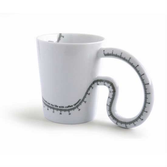 This quirky art mug features a contoured handle with ruler markings. The mug's form follows function with different shapes to create the designer's fantasy. It makes a novel gift idea for your friends or family.
