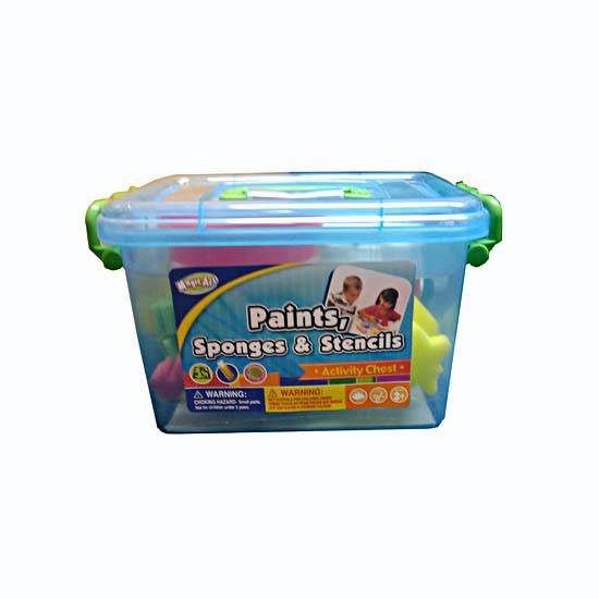 This art set features a blue casing with green locks for maximum security. It includes art supplies, such as paint, sponges and stencils. This functional art set is suitable for schools, playgroups, etc.
