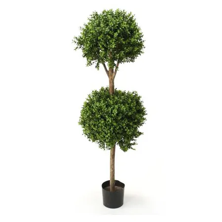 The artificial plant of the baxus ball tree plant on a plastic base.