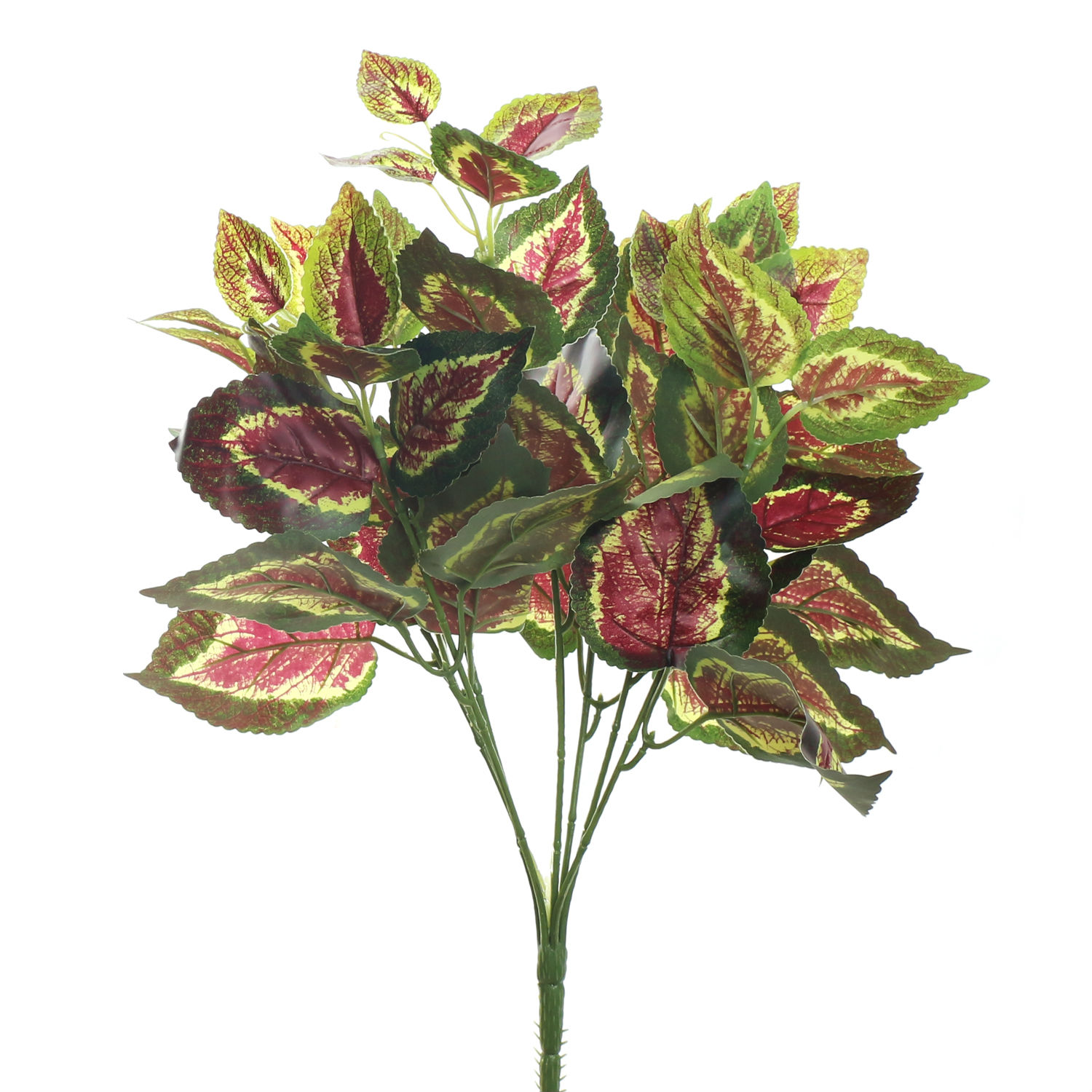 Cheery and neat, this artificial coleus graces your interior, boasting clustered ovate-shaped leaves with toothed trim to captivate eyes. Burgundy and green shades further contrast each other on the plastic-made blades for a realistic hint of style.