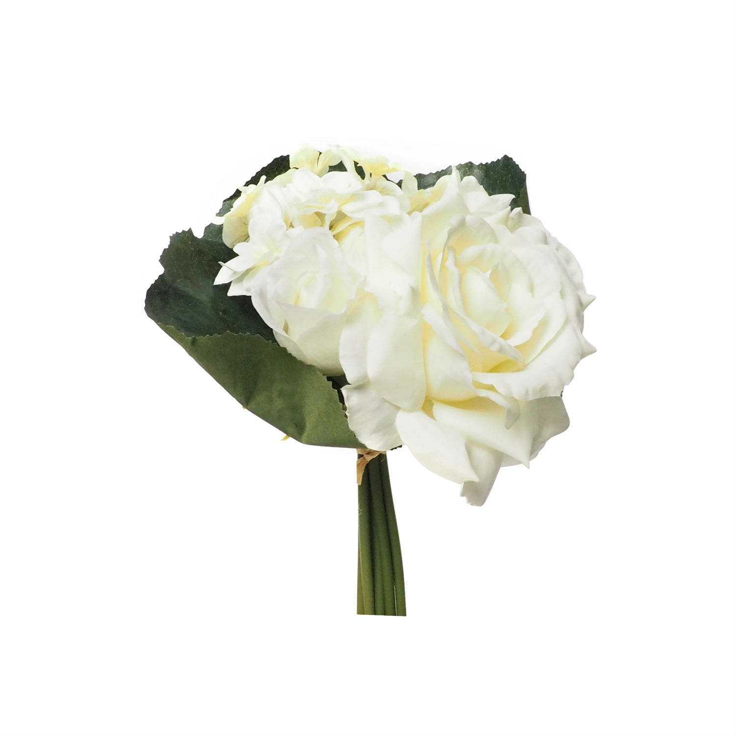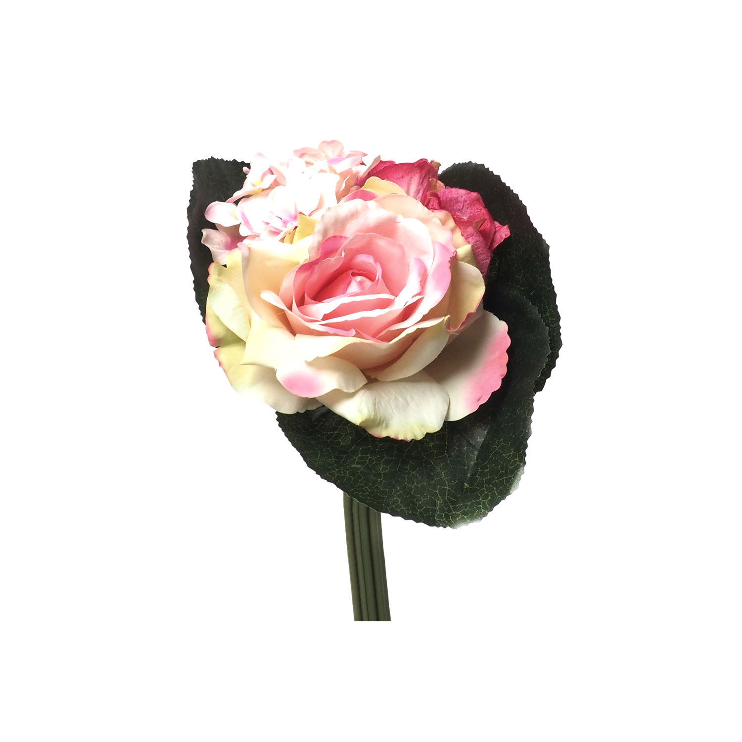 Presented here is a rose and hydrangea mix. This soft-toned bush is highlighted by the pastel hues in cream and pink. Boasting a rich layer of colors by wrapping with large textured green leaves, it looks great to stand alone with a burlap bow. Elegant and stunning, this mixed stem is perfect for vintage-inspired events.