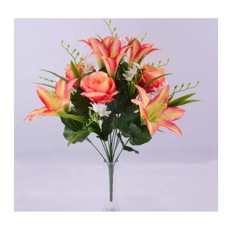 The colorful artificial 16 heads lily and rose flower with fabric and iron wire materials.