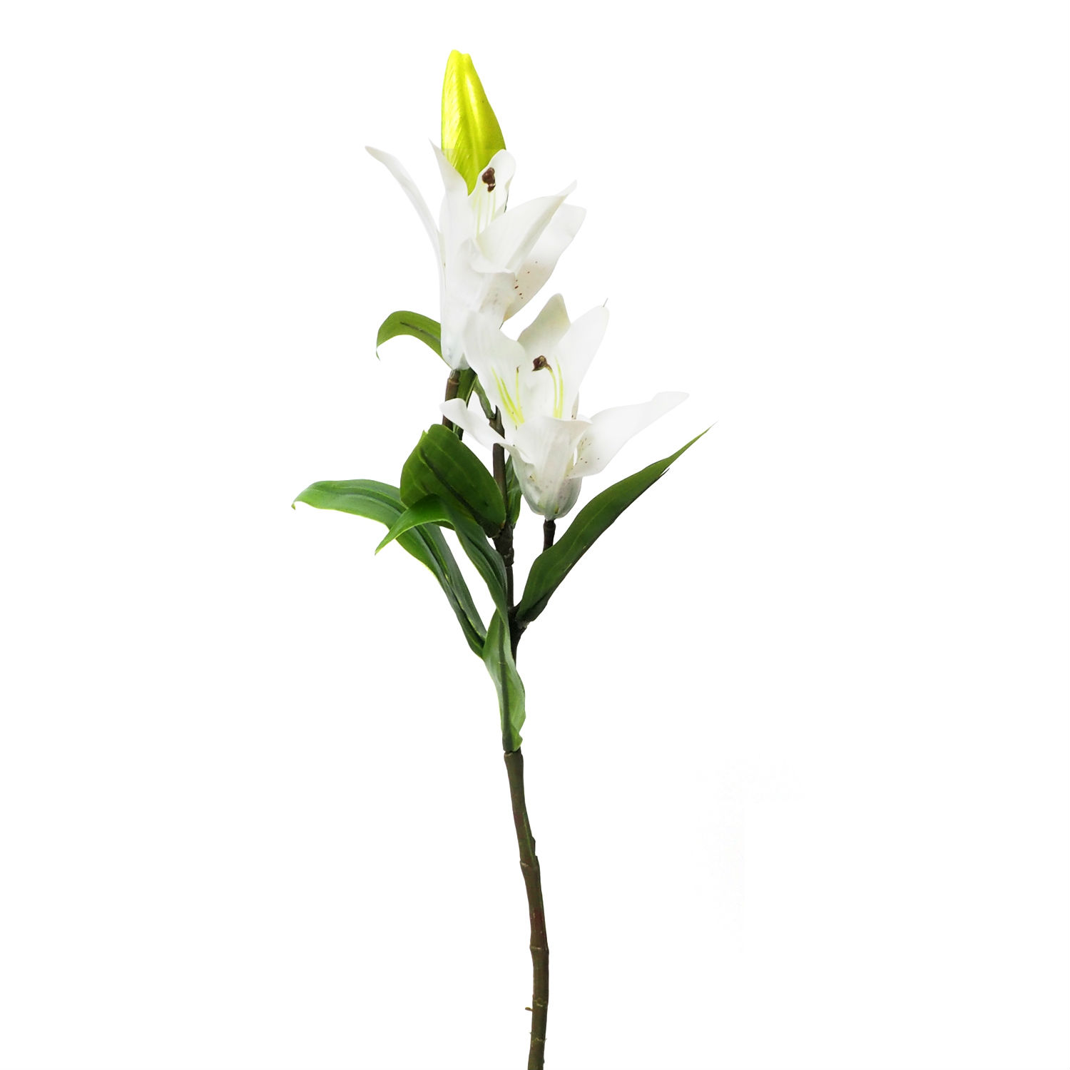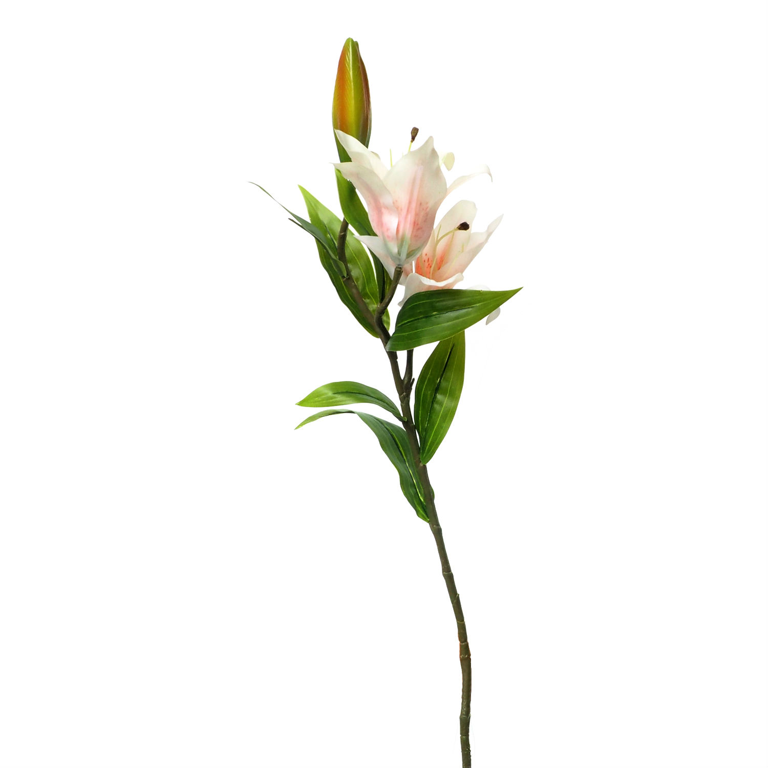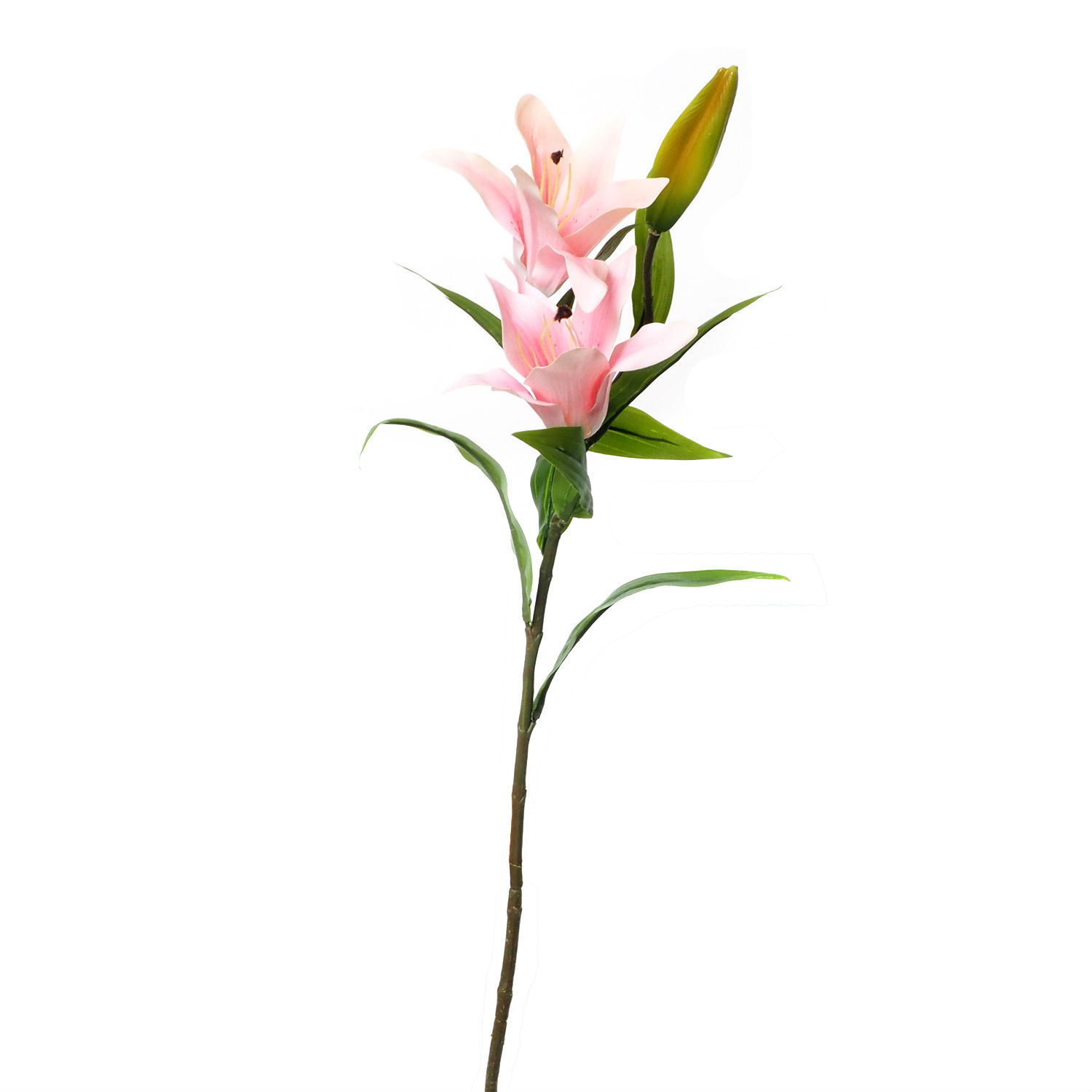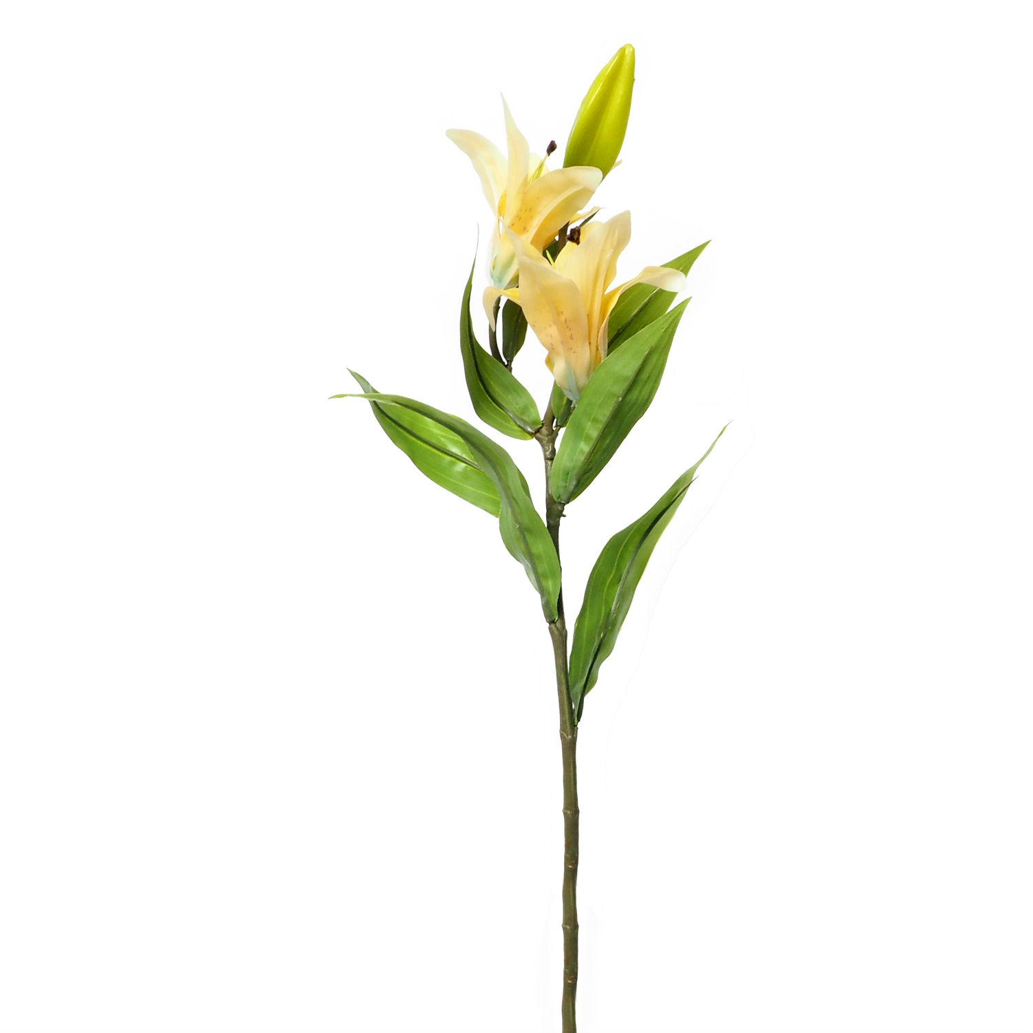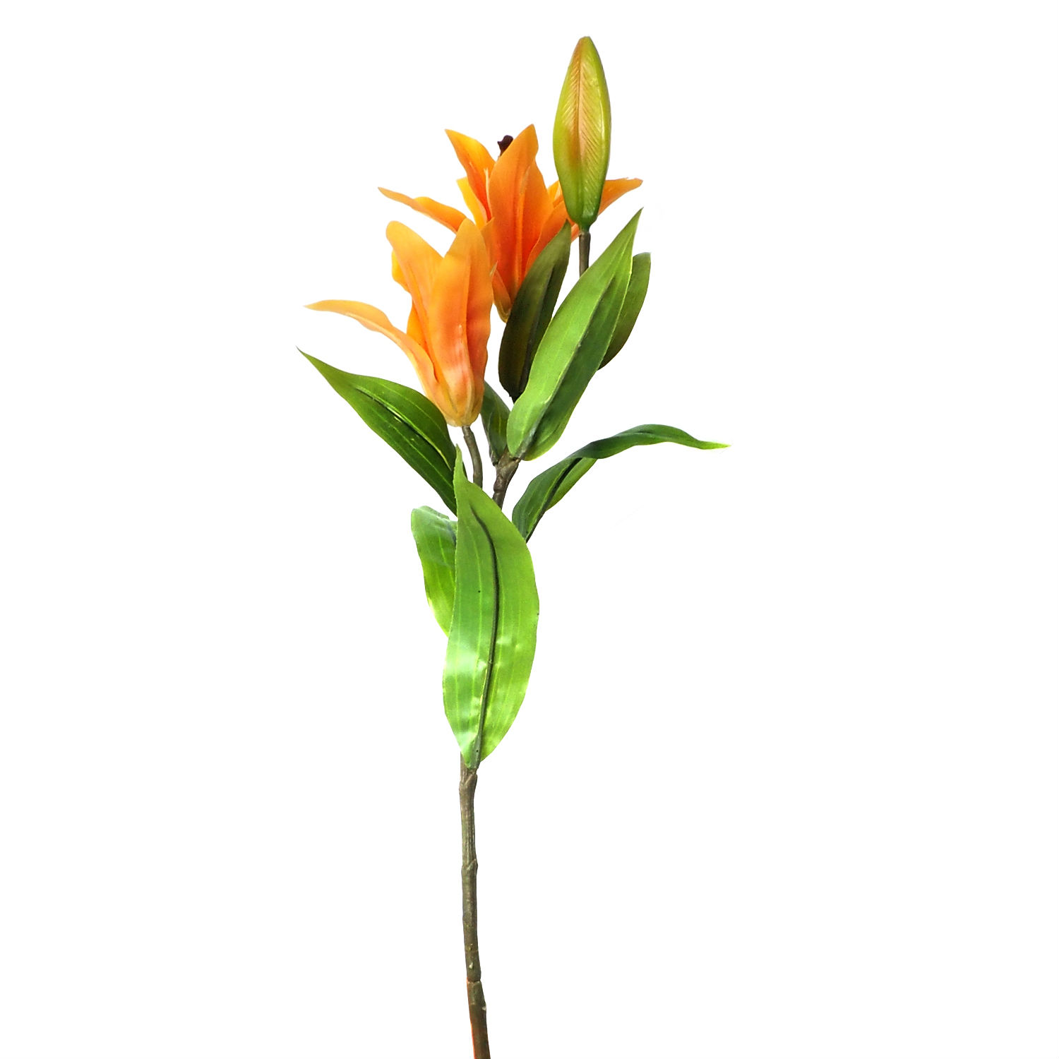 This polyester lily stem features two lilies blossom in vibrant colors, curling leaves in glossy finish and a detaily textured stem, which completes a highly life-like appearance in the materials of polyester. Appealing and long lasting, this lily stem makes a great addition to any summer-themed flower arrangement.