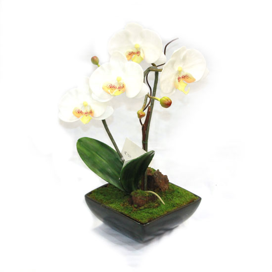 Displayed here is an artificial orchid arrangement with an elegant appearance. It comes with a matching pot in a square shape. Add a touch of style to your home decor with this artificial orchid arrangement.