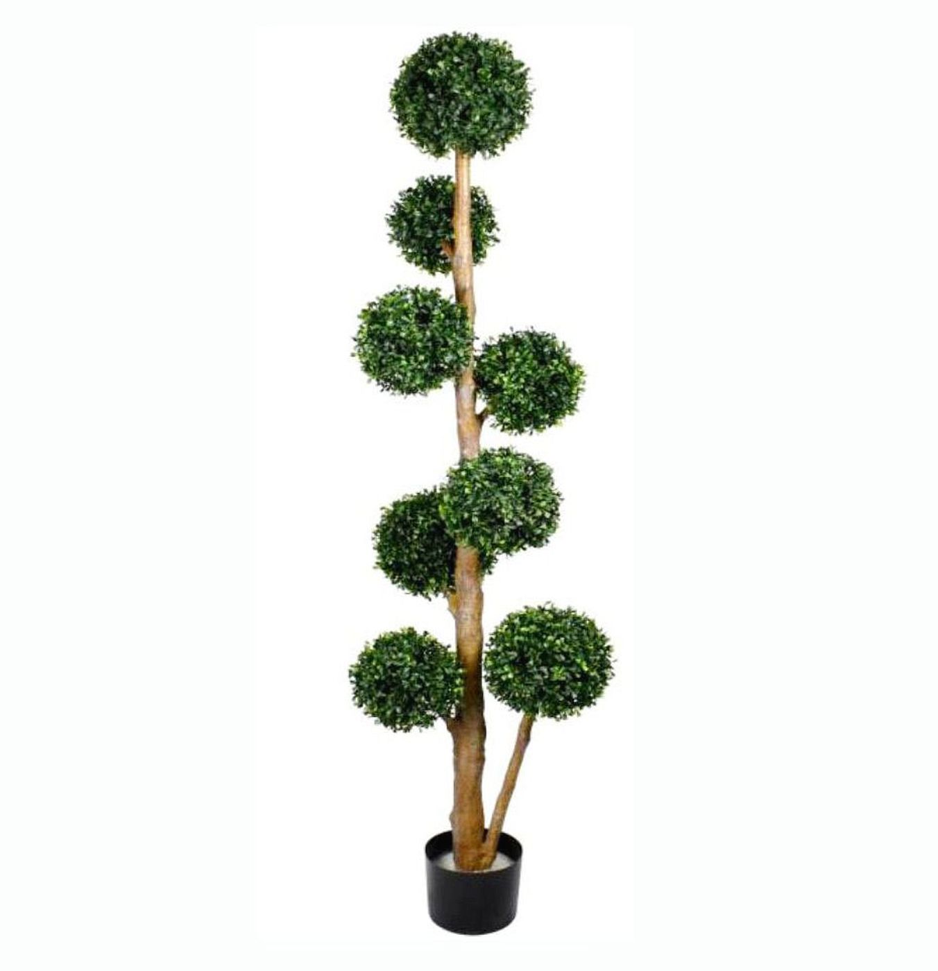 This artificial boxwood tree is made of plastic. It creates a green accent to beautify the space. It is a good decoration for your home or workplace.