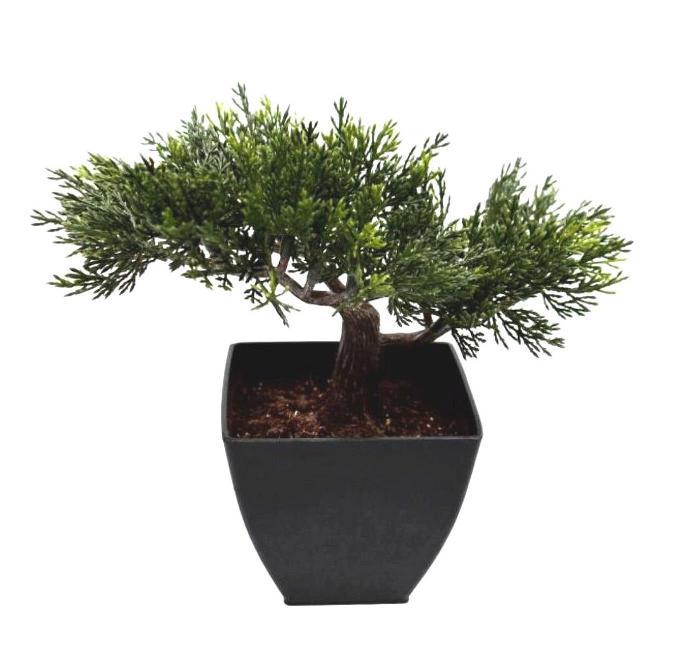 The artificial plant of the juniper bonsai on a plastic base.