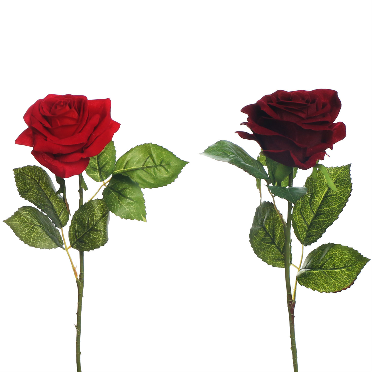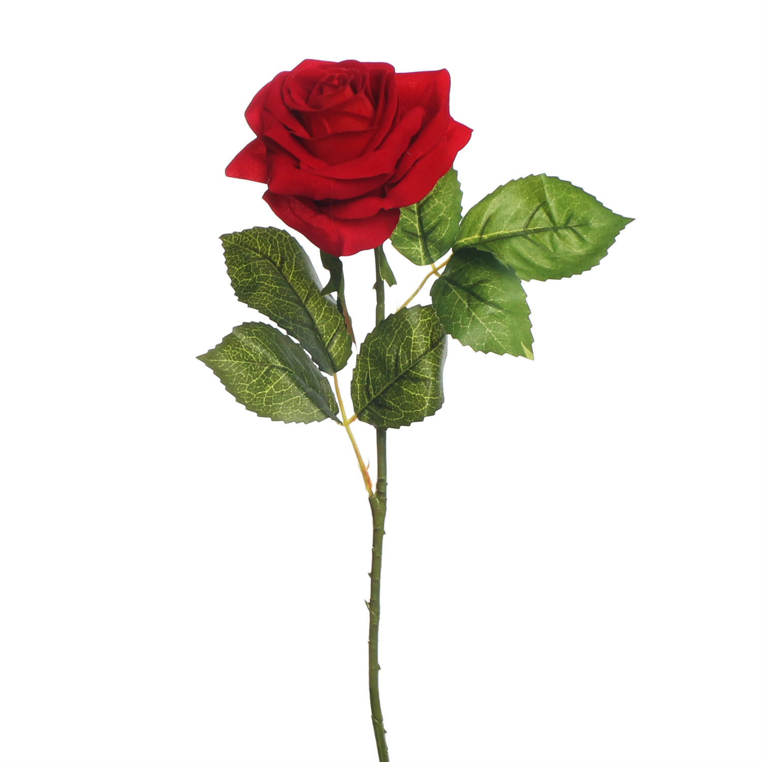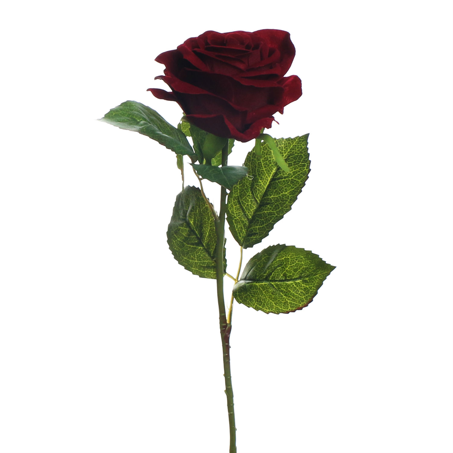 Gorgeously sumptuous, this artificial rose introduces drama to your everyday arrangement, steeping in an unashamed sultry red for definition. The solo bloom is further complemented with edged leaves and a slender spray with sharp prickles to boast realistic flair.