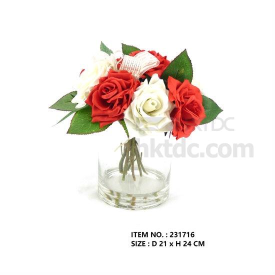 The white and red hue of this artificial potted arrangement persuades a hint of innocence within the classic charm of rose. Complemented with a neat glass vase, it sits properly on your table to channel a sophisticated vibe. Supporting leaves with edgy rims are further accented to pledge ultra-realistic feel.