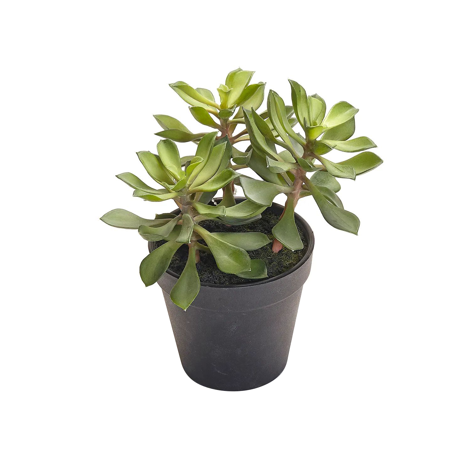 This artificial plant features three succulent plants in a black plastic pot. It has a lustrous green look and flaunts a realistic and detailed design. The artificial plant doesn't need much care and is an excellent alternative to real plants.