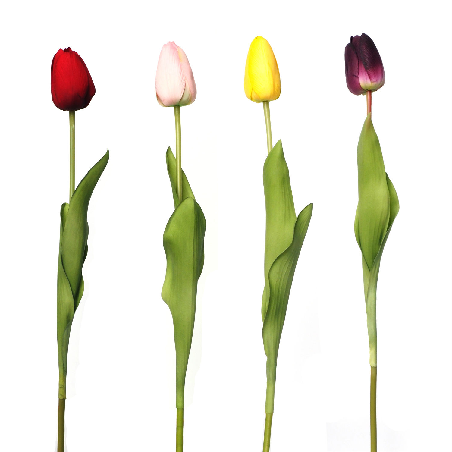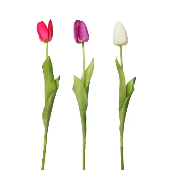 These single-stem tulips are crafted with exclusive details for a real look and touch. Each tulip is wrapped with two curly leaves for a green accent while the petals are printed in natural color gradients. The polyester materials promise enduring liveliness of these blossoms, allowing simple beauty to your home décor.