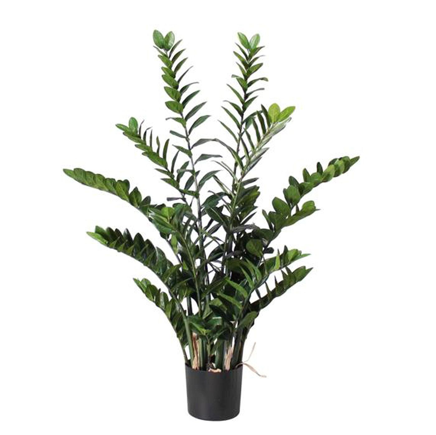 The artificial plant of the zamioculcas tree plant on a plastic base.